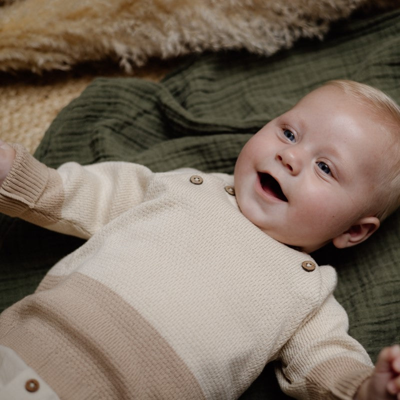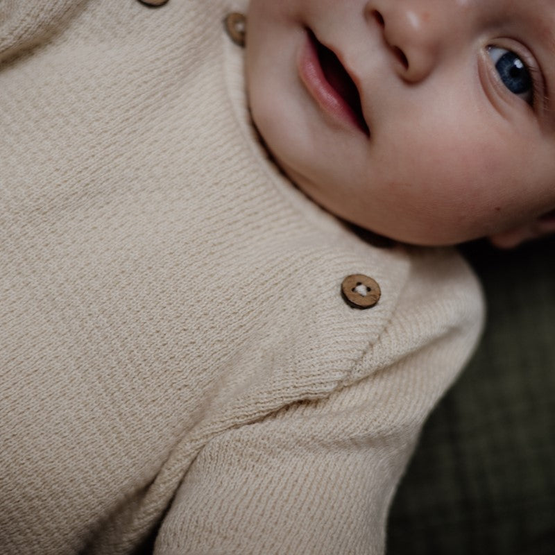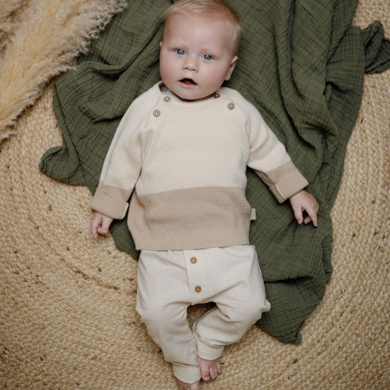 Een geweldige trui voor de beige liefhebbers! De trui heeft een mooie beige kleur met aan de onderkant een rand in de kleur zand. Als extraatje heeft het truitje nog houten knoopjes op de schouder. Een heerlijke trui voor zowel jongentjes als meisjes. Ideaal voor de wat koudere zomer avonden.